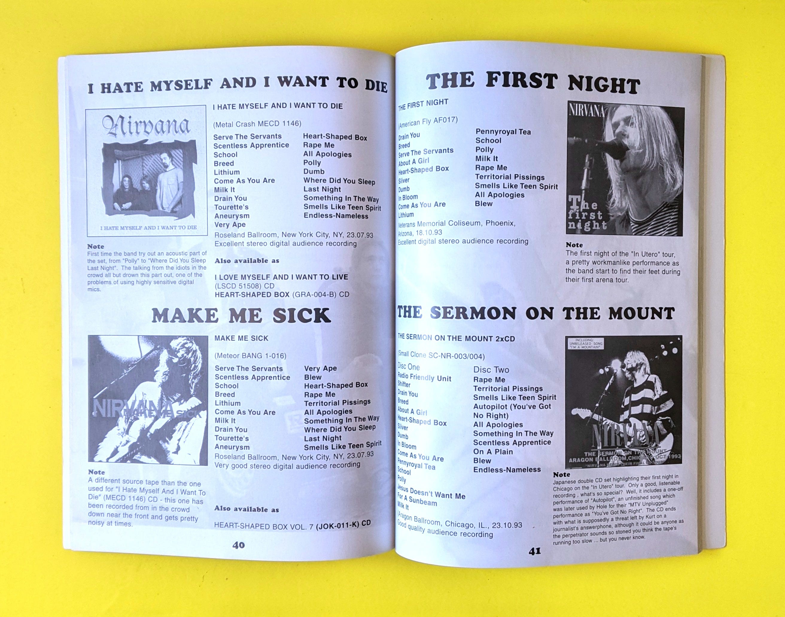 All of this lead me back to Nirvana bootlegs: a very niche aspect of my collecting as a teenager that had resulted in a modest amassing of maybe 12 titles across CD and cassette. Not long after my initial introduction to the world of unauthorised CDs, I discovered The Alternative CD & Vinyl Collectors Guide (in Virgin Megastore, no less!) that blew open the doors to a whole catalogue of Nirvana bootlegs. There was more out there than Outcesticide. A lot more.